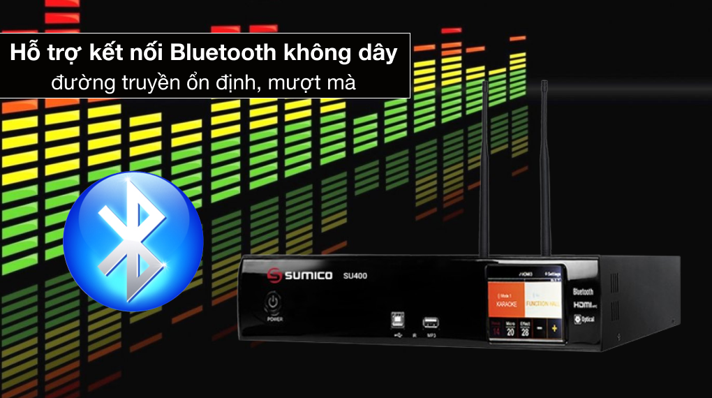 Amply Karaoke Sumico SU400 mang đến không gian âm thanh ngập tràn với hệ thống âm thanh 2.0 kênh, tổng công suất 800W, âm thanh mạnh mẽ, lôi cuốn người nghe nhờ công nghệ tạo hiệu ứng vang kỹ thuật số, trải nghiệm ca hát thoả thích qua kết nối Bluetooth. Đi kèm với amply là micro không dây chất lượng cao.