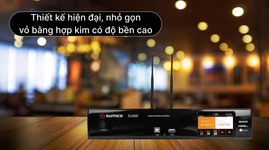 - Amply Sumico SU400 có thiết kế hiện đại, kiểu dáng gọn gàng, tông màu đen sang trọng, phù hợp với hầu hết không gian nội thất cổ điển hay hiện đại, đồng thời tăng tính thẩm mỹ cho căn phòng.
