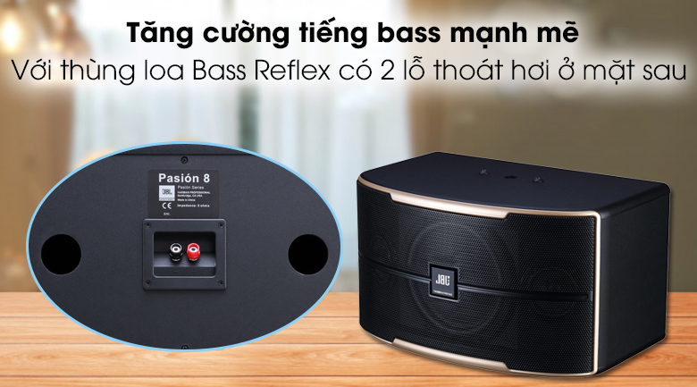 Loa JBL có kiểu thùng Bass Reflex, dạng thùng loa có 2 lỗ thoát hơi ở mặt sau giúp tăng cường tiếng bass, cho độ phủ rộng.