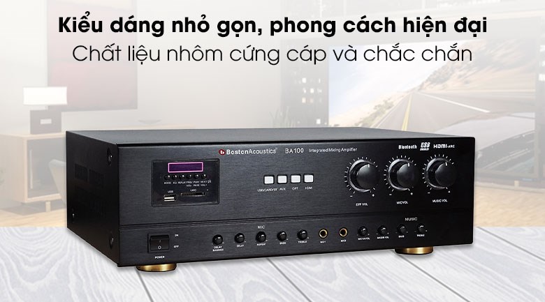 Amply Karaoke Boston Acoustics BA100 có kiểu dáng nhỏ gọn, kích thước bao gồm dài 43 cm - rộng 35 cm - cao 14 cm giúp bạn dễ dàng lựa chọn một vị trí cho chiếc amply này trong dàn âm thanh của gia đình. Amply được làm từ chất liệu nhôm cứng cáp và chắc chắn cùng với tông màu đen hiện đại, amply sẽ vô cùng hòa hợp với mọi không gian nội thất.