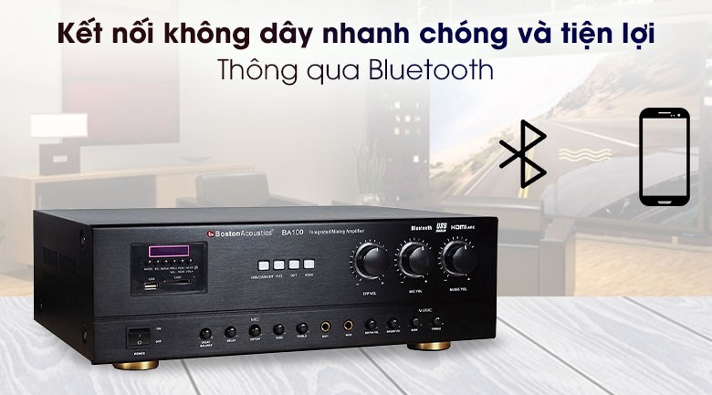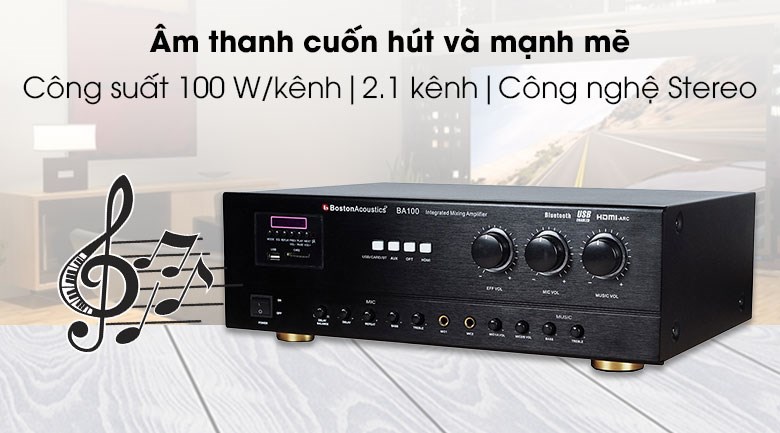 Amply Karaoke Boston Acoustics hoạt động với tổng công suất 200W, công suất 100W trên 1 kênh, số lượng kênh là 2.1 kênh kết hợp công nghệ âm thanh Stereo mang lại chất lượng âm thanh sống động hơn, chất âm mạnh mẽ lan tỏa cả không gian.