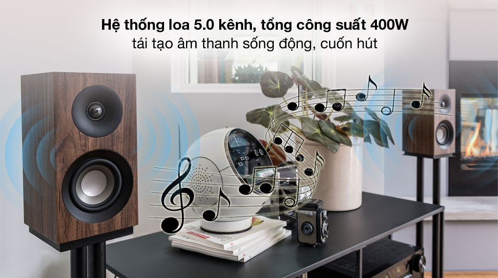 - Loa Jamo này có hệ thống 5.0 kênh gồm 2 loa Bookshelf, 1 loa Center và 2 loa Surround tái tạo không gian âm thanh ngập tràn, các dải âm sinh động và chuẩn xác, lôi cuốn người dùng.