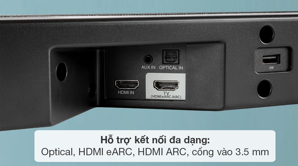 - Cùng với kết nối không dây Bluetooth, loa còn có các kết nối có dây quen thuộc như cổng Optical, HDMI eARC, HDMI ARC, cổng vào 3.5 mm cho phép sản phẩm liên kết được với đa dạng thiết bị, tạo dàn âm thanh để nghe nhạc, xem phim, hát hò thoải mái, hiệu quả hơn.