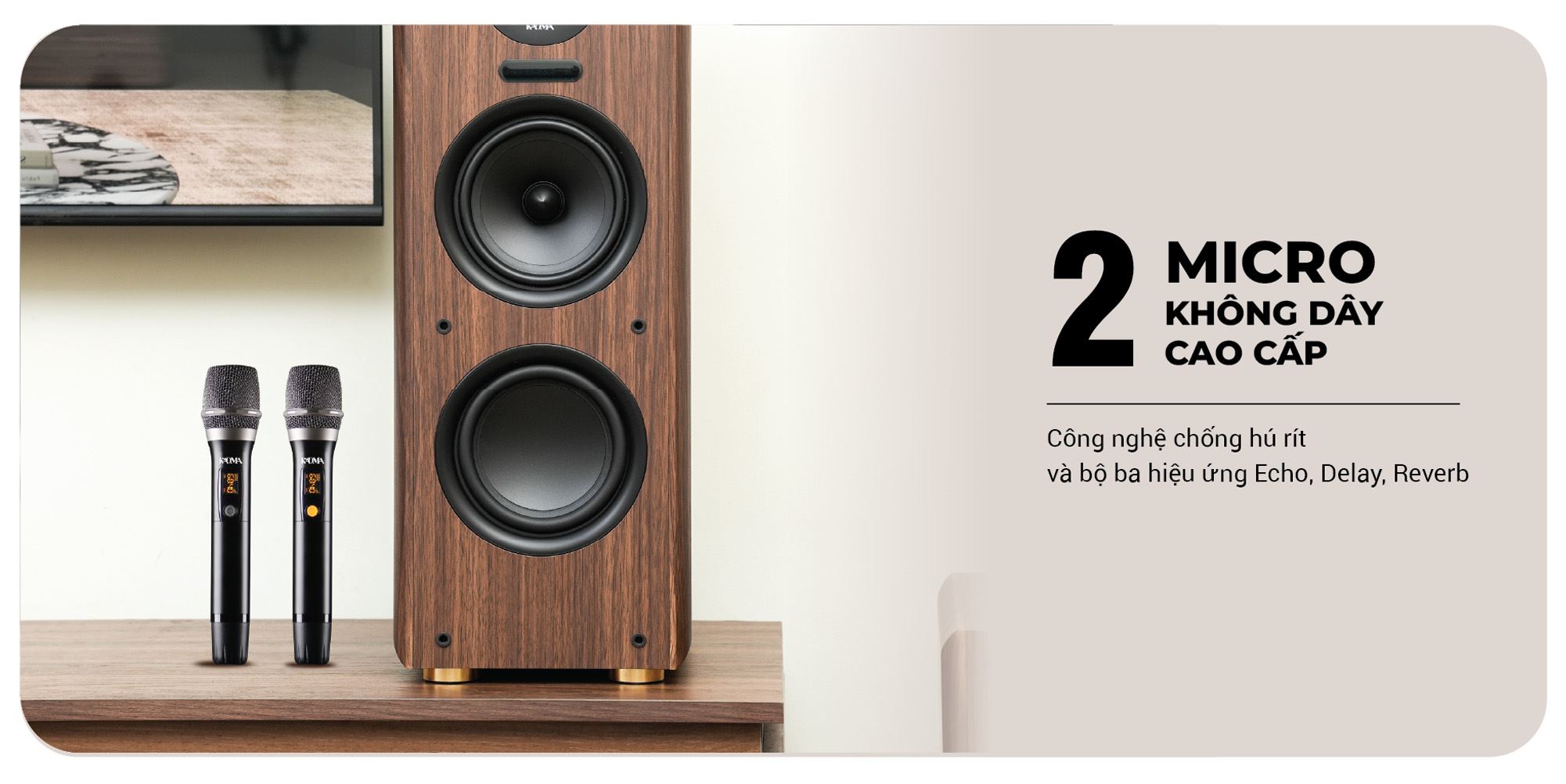 KADMA KM-BS56 là cặp loa bookshelf gồm hai loa độc lập, đi kèm hai micro không dây giúp người dùng có thể sử dụng ngay cho nhu cầu karaoke mà không cần mua thêm phụ kiện. Việc tích hợp sẵn micro cùng các hiệu chỉnh giọng hát cho thấy đây không chỉ là loa nghe nhạc thông thường mà còn được tối ưu rõ rệt cho giải trí gia đình.
