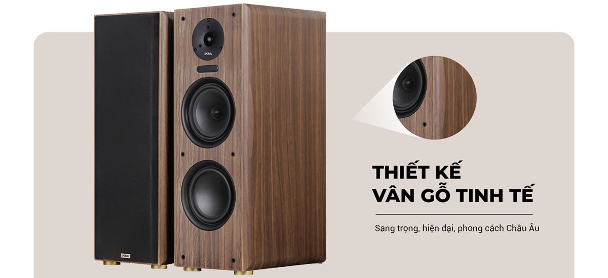 Về ngoại hình, loa mang phong cách Châu Âu hiện đại, dáng đứng cao tạo cảm giác chắc chắn ngay từ cái nhìn đầu tiên. Tông màu trung tính kết hợp lưới vải phía trước giúp loa dễ dàng hòa hợp với nhiều không gian nội thất khác nhau, từ phòng khách gia đình đến quán cà phê acoustic. Kích thước lớn cùng khối lượng gần 30 kg không chỉ mang độ “đầm” khi đặt loa mà còn góp phần giúp âm thanh ổn định hơn khi mở lớn.