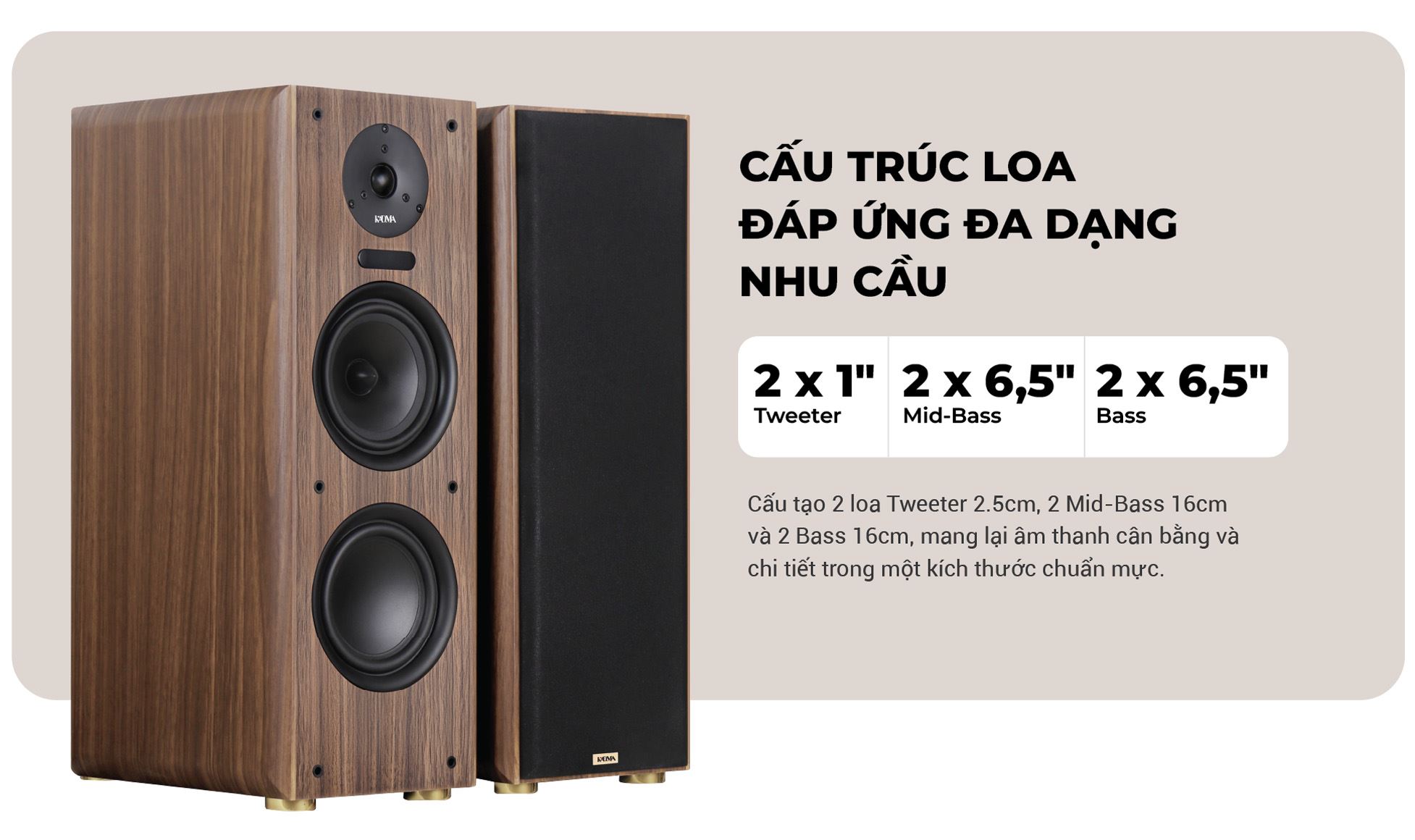 • Hệ thống loa 3 đường tiếng tái tạo âm thanh chi tiết, tách bạch rõ ràng giữa bass - mid - treble.