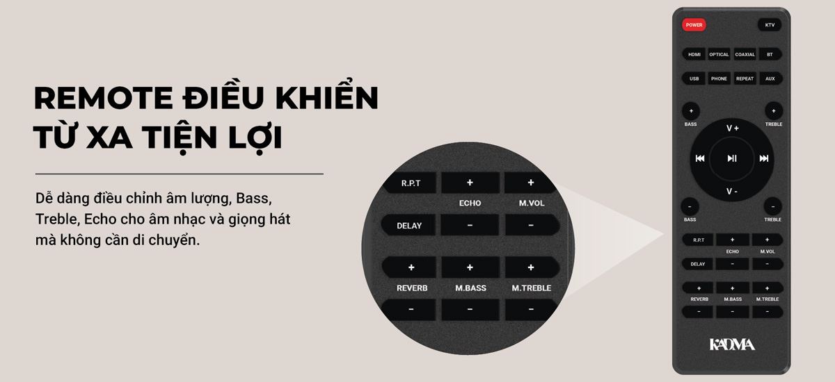 KM-BS56 không chạy theo các tính năng smart phức tạp mà tập trung vào những gì người dùng cần nhất. Các hiệu chỉnh Echo, Reverb và Delay cho micro giúp giọng hát trở nên dày, mượt và nịnh tai hơn, kể cả với người không chuyên. Đây là điểm rất được ưa chuộng trong các bộ loa karaoke gia đình, bởi nó giúp ai cũng có thể hát hay hơn so với giọng thật.