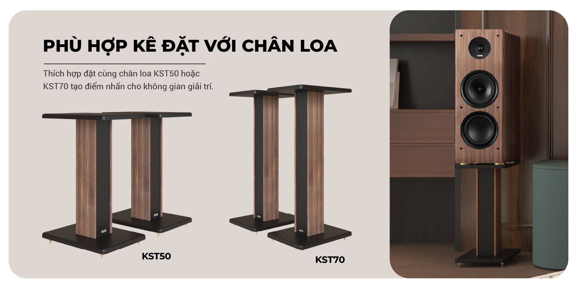 Để giúp cho không gian trong nhà trở nên sang trọng hơn, người dùng có thể kết hợp kê đặt cùng với chân loa KST50 hoặc KST70.