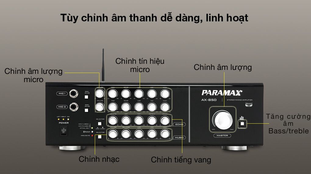 Amply Karaoke Paramax AX-850 hỗ trợ bộ điều khiển âm linh hoạt cho phép điều chỉnh linh hoạt âm Bass, Treble, tùy chỉnh âm lượng riêng cho từng micro, dễ dàng phối các bản nhạc song ca cho cả nam và nữ trên tông âm hài hòa, mượt mà.