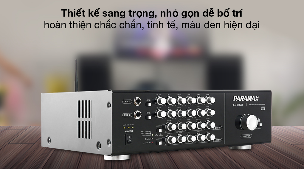 Amply Karaoke Paramax AX-850 có kích thước dài 42 cm - rộng 36.5 cm - cao 13.9 cm và khối lượng 9.5 kg dễ dàng để di chuyển và bố trí cho nhiều vị trí, không chiếm diện tích, hài hòa cho không gian nội thất hiện đại.