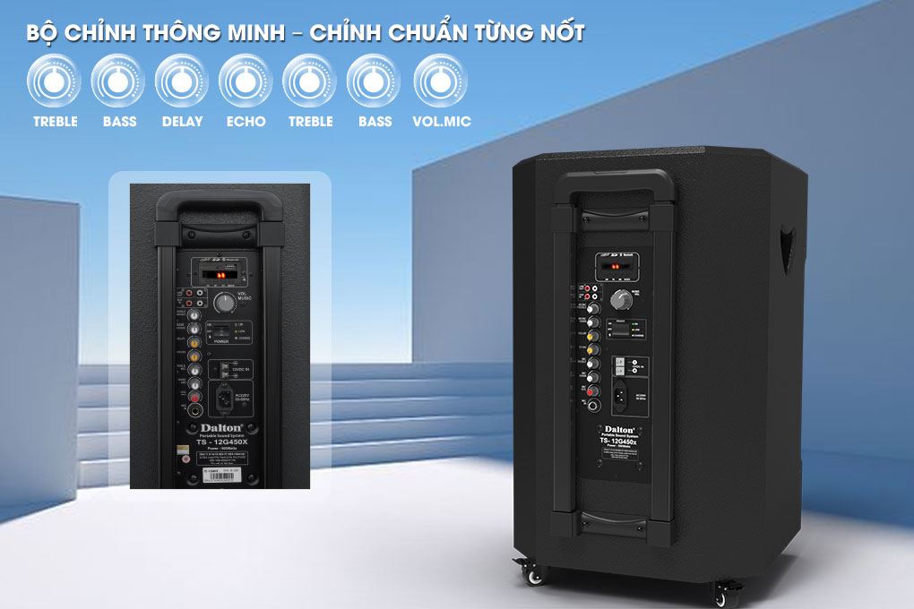 Dalton TS-12G450X có kiểu dáng loa kéo dạng đứng, tổng thể cân đối và dễ bố trí trong phòng khách, khu vực sinh hoạt chung hoặc mang ra sân vườn khi cần đổi không gian. Thiết kế hướng đến sự chắc chắn khi đặt cố định, đồng thời vẫn thuận tiện cho việc di chuyển.