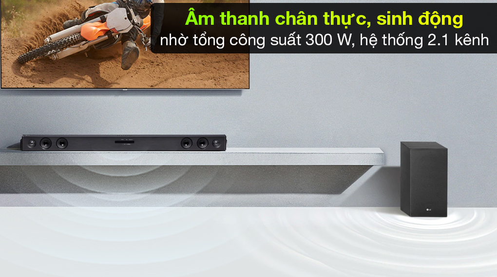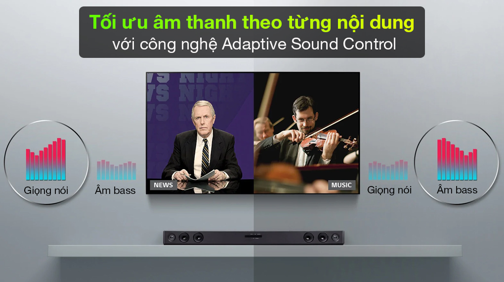 Loa soundbar LG hỗ trợ công nghệ Adaptive Sound Control có khả năng nhận biết, phân tích nội dung đang phát, tự tối ưu cài đặt âm thanh phù hợp với các nội dung khác nhau nhờ đó bạn có thể nghe rõ hội thoại trong phim, nghe nhạc du dương, đắm chìm hơn.