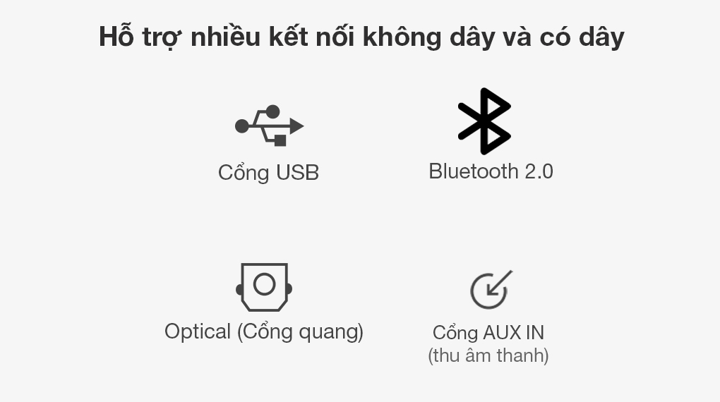 Có các cổng USB, Optical, jack 3.5 mm, Bluetooth 2.0 cho khả năng kết nối được nhiều thiết bị, cho bạn tận hưởng sở thích xem phim, nghe nhạc dễ dàng hơn bao giờ hết.