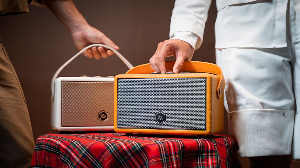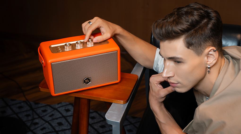 Loa này gây ấn tượng ngay từ cái nhìn đầu tiên với vẻ ngoài mang đậm hơi thở retro kinh điển, pha trộn khéo léo cùng những đường nét thiết kế đương đại. Phần vỏ loa được chế tác tinh xảo từ kim loại cứng cáp, sau đó được phủ một lớp cao su cao cấp bên ngoài, không chỉ tăng cường độ bền bỉ chống trầy xước mà còn mang lại cảm giác cầm nắm vững chắc, thoải mái.