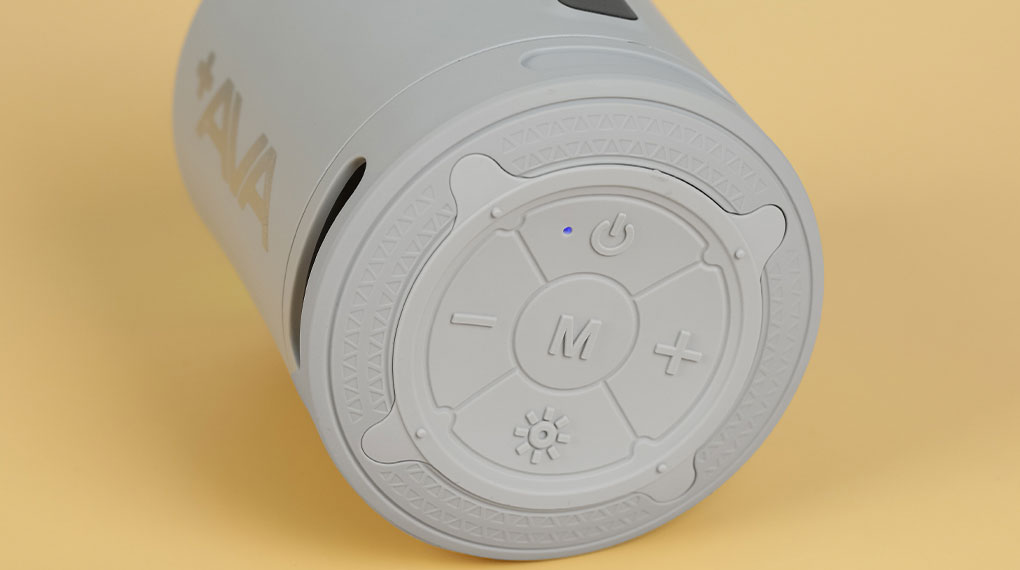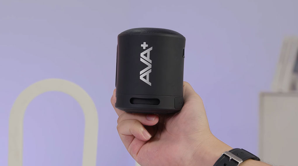 Logo AVA+ to bản nằm dọc trên thân loa, nhìn là biết ngay nhà sản xuất. Vỏ loa được làm bằng nhựa cao cấp, sờ vào thấy mịn mịn, hơi nhám nhám, cầm chắc tay lắm. Mình đổ mồ hôi tay mà cầm loa cũng không bị trơn tuột. Nếu loa bị dính bẩn thì mình chỉ cần lấy khăn mềm hoặc khăn ướt lau là sạch, rất tiện lợi.