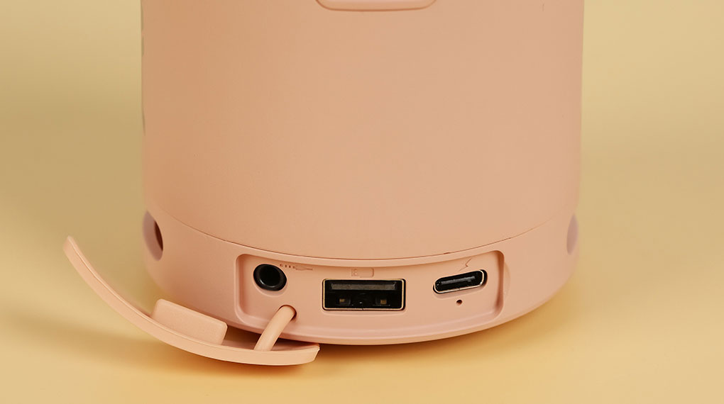 Loa có một nắp cao su ở phía dưới, bên trong nắp là các cổng kết nối: AUX IN, USB A và cổng sạc Type-C. Mình rất thích cách thiết kế này, nắp cao su giúp bảo vệ các cổng kết nối khỏi bụi bẩn và nước. Ở bên dưới cổng sạc có một đèn thông báo, đèn sẽ sáng lên khi mình cắm sạc cho loa và tự tắt khi loa đầy pin. Mình rất thích tính năng này, nó giúp mình biết được tình trạng pin của loa mà không cần mở loa ra kiểm tra.
