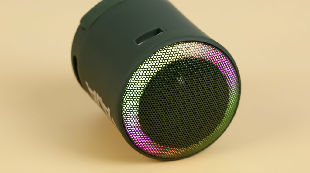 Nhìn em loa này, ấn tượng đầu tiên của mình là phần màng loa chính trên đỉnh. Màng loa này được tích hợp thêm đèn LED RGB chạy xung quanh phần viền, tạo nên một vẻ ngoài vô cùng nổi bật và bắt mắt. Đèn có nhiều chế độ sáng cho mình lựa chọn, từ sáng bình thường, sáng loang, sáng nhấp nháy đến sáng nhấp nháy theo nhạc. Mình thích nhất chế độ sáng nhấp nháy theo nhạc, tạo hiệu ứng vô cùng đẹp mắt và bắt mắt.