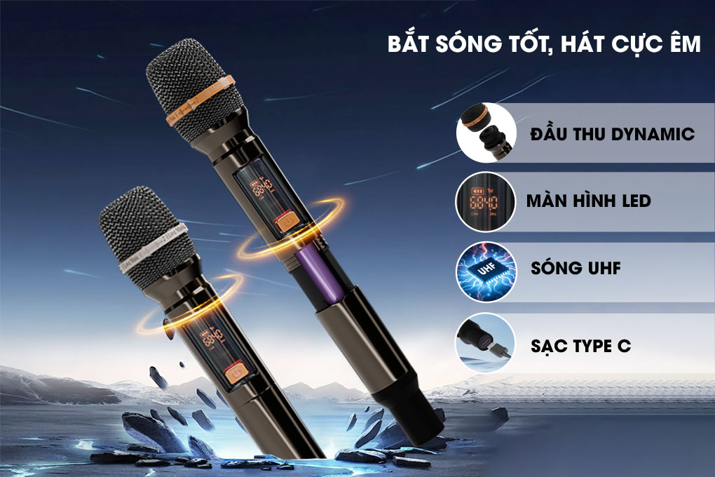 Bộ 2 micro không dây sóng UHF đi kèm hỗ trợ các tần số tùy chỉnh, giúp bắt sóng ổn định và hạn chế nhiễu khi hát trong không gian rộng. Bạn có thể dễ đổi kênh để tránh trùng tần số, giữ buổi hát liền mạch hơn.