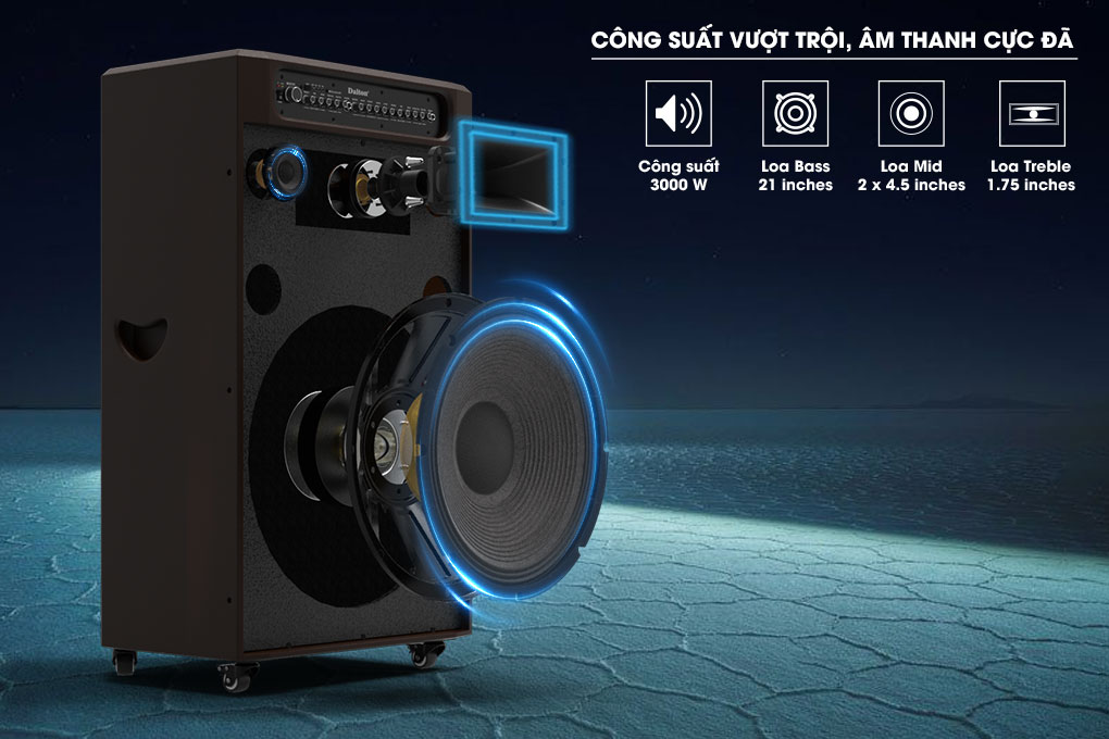 Loa điện karaoke Dalton DA-21A3000 hướng đến nhu cầu hát karaoke và trình diễn trong không gian rộng. Sản phẩm có công suất lớn 3000W, cấu trúc 3 đường tiếng, dùng nguồn điện trực tiếp, phù hợp cho hội trường, sân khấu nhỏ hoặc các sự kiện.