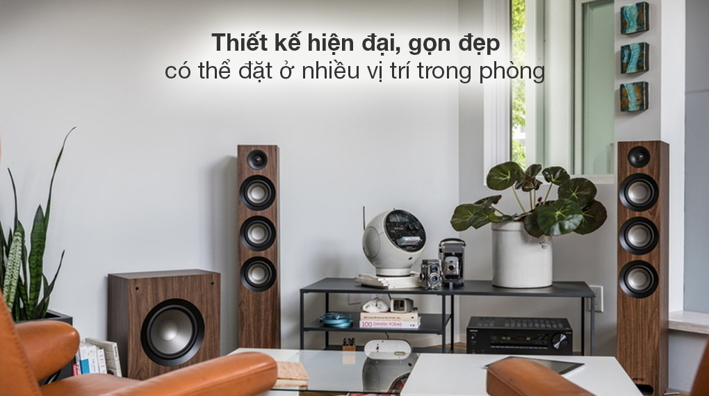 - Jamo S808 Walnut có kiểu dáng hình hộp chữ nhật đứng với thiết kế vuông vức, hiện đại, tông màu nâu trang nhã, góp phần nâng tầm phong cách cho không gian nội thất gia đình.