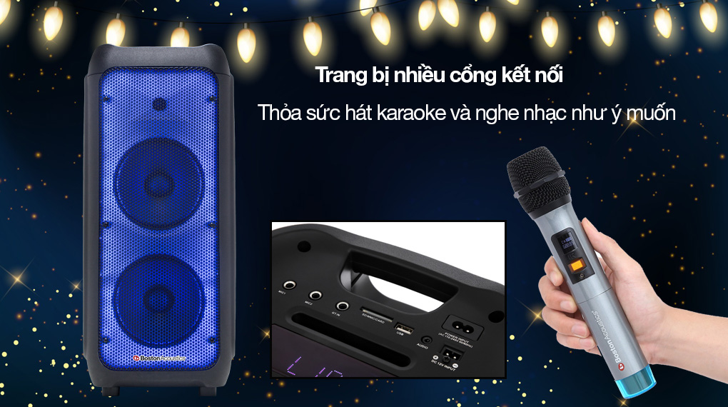 - Loa PARTY BOX BA-1002PB có khả năng phát ra 2 đường tiếng từ hệ thống gồm có: 2 loa Bass (đường kính 25.4 cm) chịu trách nhiệm tái tạo âm trầm giúp bạn nghe được các nốt trầm dày chắc và mạnh mẽ hơn và 1 loa Treble được thiết kế theo cấu trúc bánh Piezo, giúp cho các nốt bổng trở nên vang và trong trẻo hơn.