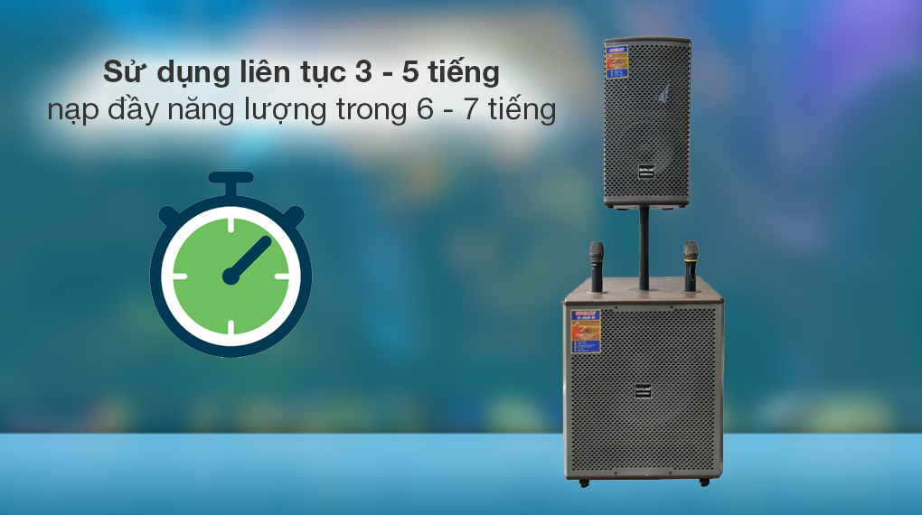 Có thể sử dụng liền mạch trong 3 - 5 tiếng, nạp đầy năng lượng trong vòng 6 - 7 tiếng, thiết bị đáp ứng nhu cầu trải nghiệm linh hoạt ở nhiều địa điểm khác nhau từ trong nhà đến ngoài trời, ở nơi có nguồn điện trực tiếp hoặc không có, người dùng đều có thể nghe nhạc, hát karaoke tùy thích, giúp tăng sự hứng khởi, vui vẻ cho không gian bữa tiệc.