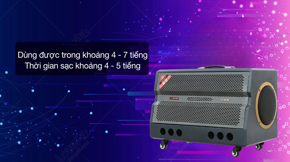 - Loa karaoke xách tay này trang bị pin lithium dung lượng lớn, loa có thể hoạt động liên tục từ 4 - 7 tiếng tùy theo mức âm lượng, đáp ứng tốt cho các buổi tiệc hay dã ngoại kéo dài.