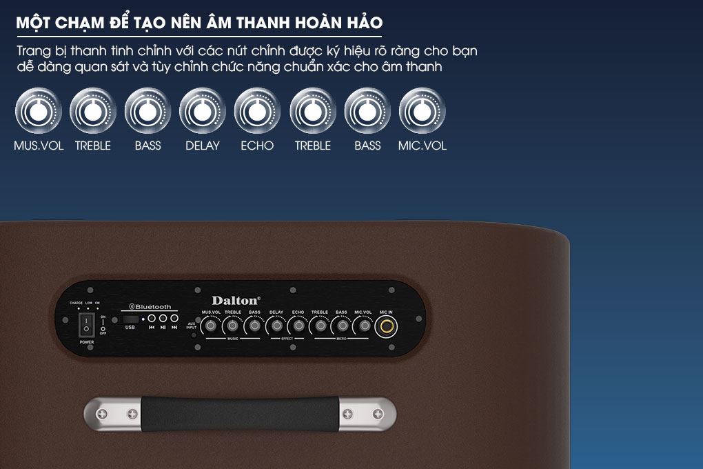 Chiếc loa karaoke xách tay Dalton này được thiết kế 2 đường tiếng với tổng công suất 750W, đáp ứng tốt nhu cầu hát karaoke và nghe nhạc trong không gian vừa và tương đối rộng như phòng khách lớn hoặc buổi họp mặt đông người.