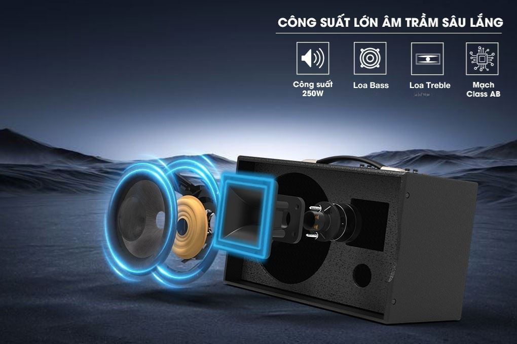 Hệ thống gồm 1 loa bass khoảng 20 cm1 loa treble khoảng 2.5 cm, tái tạo âm trầm có độ dày và dải cao sáng rõ để bản nhạc có chi tiết hơn. Khi hát karaoke, giọng thường nổi bật và dễ bắt nhịp theo nền nhạc.