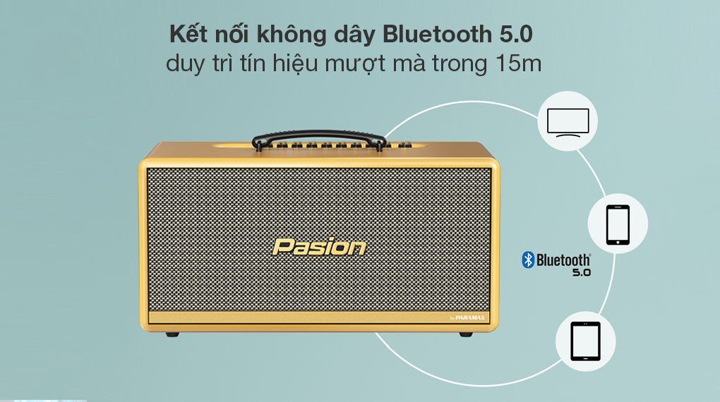 Loa karaoke xách tay PASION 2c Gold gỗ phủ sơn thể hiện gu thẩm mỹ thời thượng của bạn với vẻ ngoài nổi bật, giúp mọi bữa tiệc trở nên sôi động, cuồng nhiệt hơn với tổng công suất 400W, 3 đường tiếng, cho bạn tự tin mang đến mọi nơi khi dùng pin sạc có thời gian dùng từ 2 đến 10 tiếng.