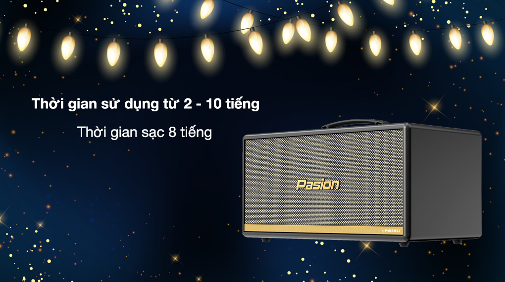 Loa karaoke xách tay PASION 400W này có thời gian sạc tầm 8 tiếng và thời gian sử dụng khoảng 2 - 10 tiếng, đáp ứng cho nhu cầu sử dụng ở các không gian đa dạng như trên xe du lịch, xe ô tô, trong nhà cho đến ngoài trời. Không những thế, bạn vừa có thể cắm sạc điện trực tiếp để sử dụng loa tùy theo nhu cầu giải trí.