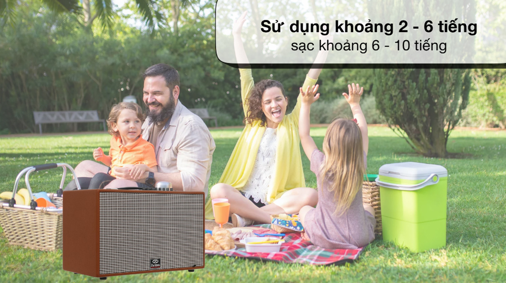 - Loa có thời gian sạc đầy khoảng 6 - 10 tiếng. Thời gian dùng liên tục từ 2 - 6 tiếng tùy vào mức âm lượng, đảm bảo không bị gián đoạn trong quá trình sử dụng.