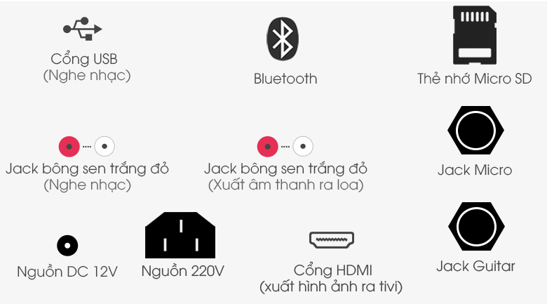 Cổng USB, thẻ nhớ SD cho khả năng phát dữ liệu âm thanh từ thiết bị ngoài dễ dàng, nghe FM radio linh hoạt, kết nối Bluetooth không dây cho người dùng kết nối loa kéo cùng laptop, điện thoại, máy tính bảng, tivi nhanh chóng. Người dùng cũng có thể kết nối loa với tivi bằng jack bông sen, jack 6.5 Micro.