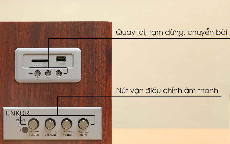 Với 4 nút vặn chính để điều chỉnh âm thanh: Volume (âm lượng), Balance (điều chỉnh cân bằng âm thanh giữa 2 loa vệ tinh), Treble, Bass, ngoài ra phía trên có thêm 3 nút nhấn phía trên để quay lại, tạm dừng và chuyển bài (nếu phát nhạc bằng thẻ nhớ, USB).