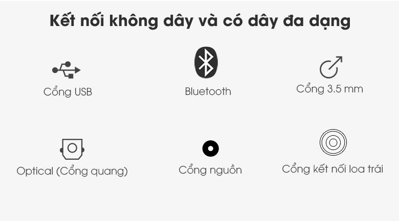 Gồm Bluetooth 5.0, cổng 3.5 mm, cổng USB, cổng Optical, cổng nguồn, cổng kết nối loa trái, cho bạn kết nối từ laptop, máy tính để bàn đến điện thoại dễ dàng, nâng cao hiệu suất sử dụng loa tối ưu hơn.