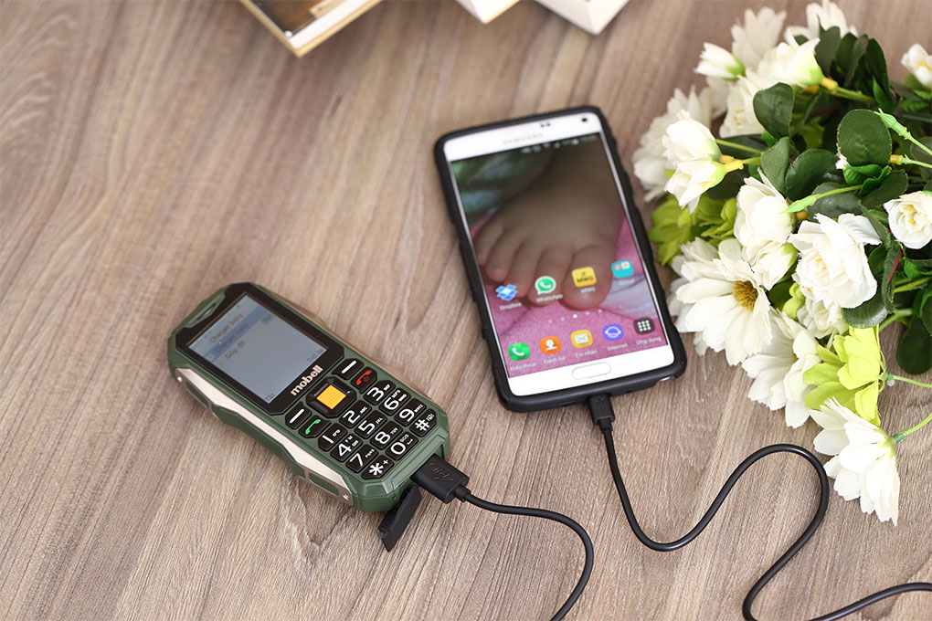 Điện thoại Mobell có sẵn cổng USB để bạn cắm sạc cho máy khác không cần dùng thêm cáp chuyển OTG, như vậy chiếc điện thoại này có thể thay thế một viên pin dự phòng thực thụ.