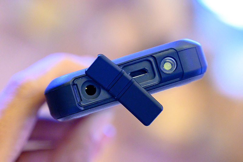 Phía trên máy là cổng sạc, jack tai nghe 3.5 và đèn pin LED có độ sáng 198 lumen được bao bọc bởi một lớp nhựa giúp bạn có thể sử dụng như một đèn pin truyền thống.