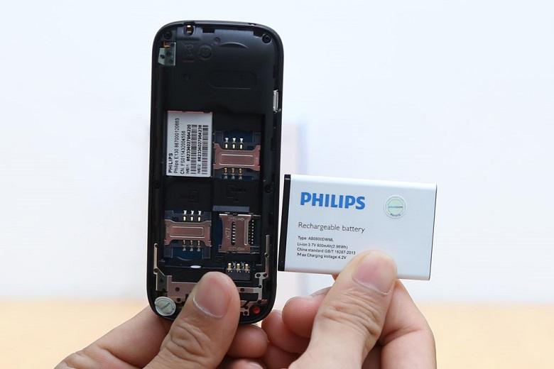 Nhà sản xuất Philips trang bị cho máy viên pin có dung lượng là 800mAh, cho thời gian sử dụng đến 4 ngày nếu biết cách dùng hợp lý. Đây thực sự là chiếc điện thoại rất thích hợp để đồng hành cùng bạn khi đi xa.