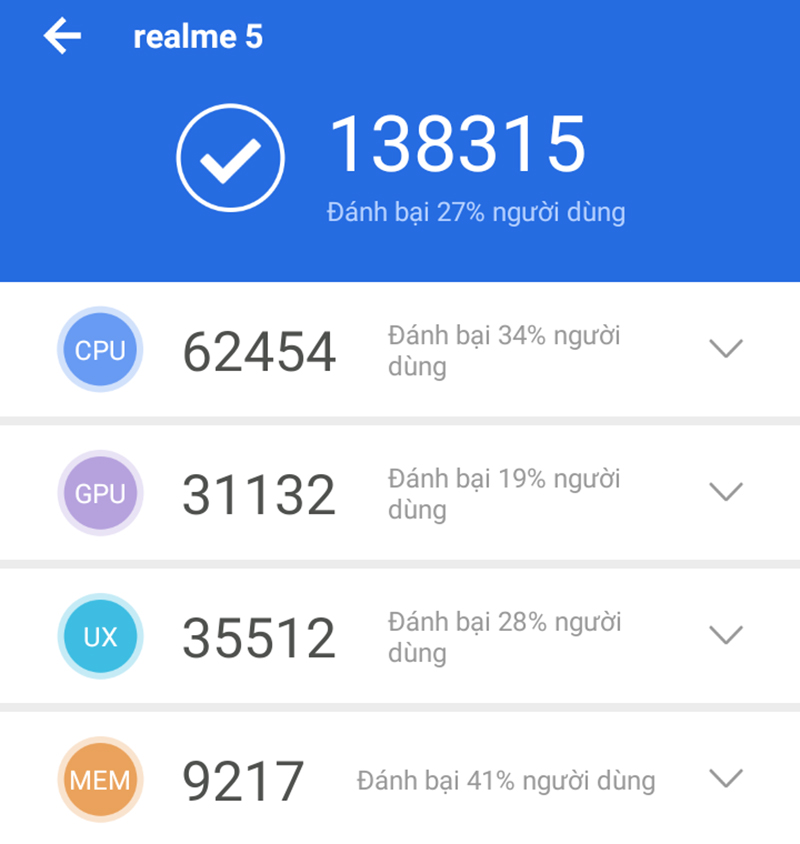 Điểm hiệu năng Antutu của máy đạt 138.000 điểm. Với cấu hình này, các tựa game phổ biến hiện nay như Liên quân Mobile, Free Fire,... không thể làm khó Realme 5 4GB.