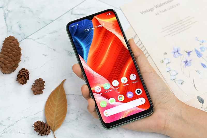 Realme C11 ấn tượng với kích thước màn hình 6.5 inch, với camera trước dạng giọt nước, bo tròn mềm mại, cùng với đó là viền màn hình 2 bên mỏng, giúp tăng trải nghiệm khi xem phim chơi game trên điện thoại này.