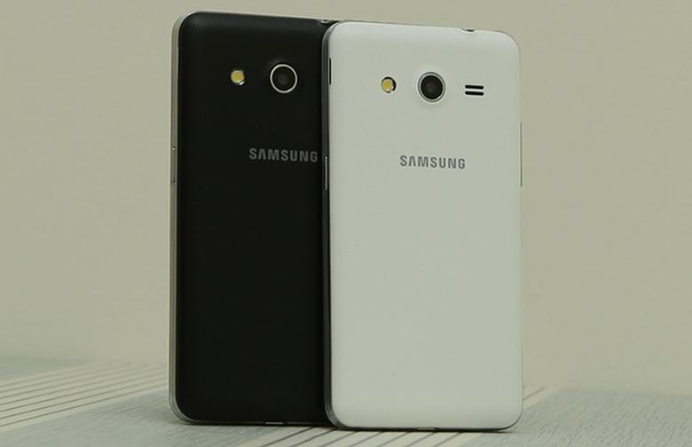 Samsung Galaxy Core 2 mang thiết kế đặc trưng của dòng điện thoại Galaxy với các góc bo tròn, phím home cứng, và viền giả kim loại sáng bóng. Nắp lưng của máy được làm giả da rất sang trọng, giúp tăng độ bền, và không bám bẩn.