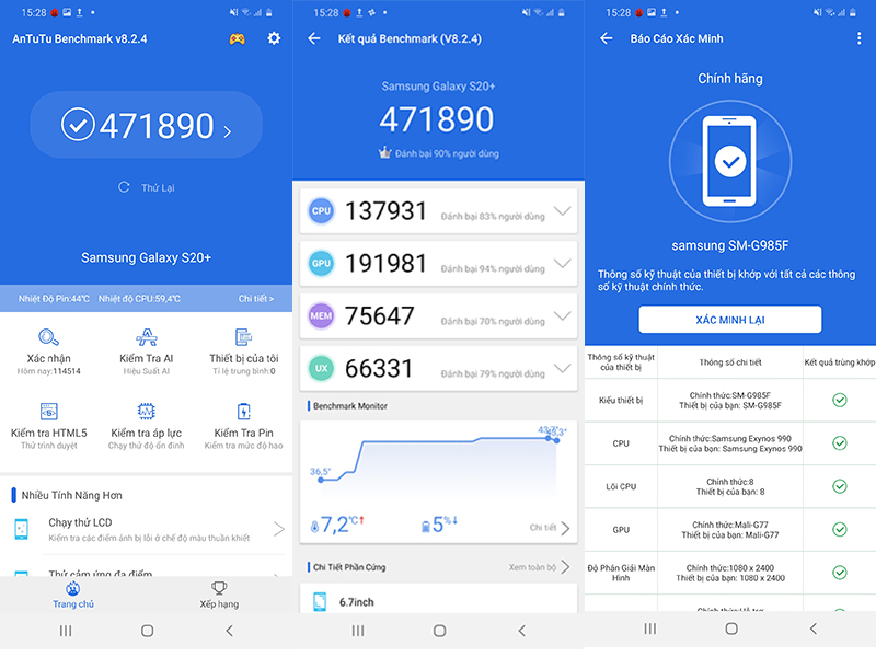 Hiệu năng của máy được chứng minh khi điểm Antutu đo được trên Galaxy S20 Plus lên tới 471.890 điểm, giúp điện thoại chơi game mượt mà, thoải mái chiến các tựa game nặng yêu cầu mức đồ họa cao hay kể cả các ứng dụng thực tế ảo yêu cầu GPU mạnh mẽ.