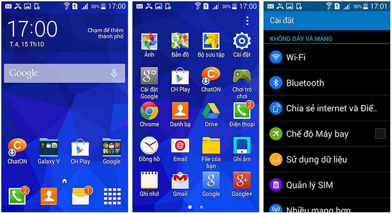 Đi kèm với Samsung Galaxy V là hệ điều hành Android KitKat 4.4.2 với giao diện dạng phẳng tương tự Galaxy S5. Tốc độ phản hồi nhanh và ổn định hơn, cùng với nhiều tiện ích và ứng dụng độc quyền của Samsung dành riêng cho người dùng Việt Nam như tính năng khuếch trương âm lượng cuộc gọi, phím gọi khẩn cấp, ứng dụng VOV giao thông…