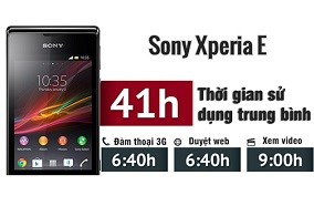 Kết nối đa dạngSony Xperia E được trang bị đầy đủ kết nối 3G, Wifi, GPS, và Bluetooth, giúp người dùng thoải mái kết nối internet, định vị bản đồ và chia sẻ dữ liệu mọi lúc, mọi nơi. Ngoài ra, máy được hỗ trợ camera 3.2MP, đáp ứng được nhu cầu chụp ảnh và chia sẻ ngay lên mạng xã hội. | Thời lượng pin tốtSony Xperia E có pin dung lượng 1540mAh cho thời gian sử dụng khá lâu, có thể lên tới 2 ngày nếu sử dụng điện thoại để nghe - gọi - nhắn tin bình thường, hoặc hơn 1 ngày với cường độ sử dụng liên tục. |