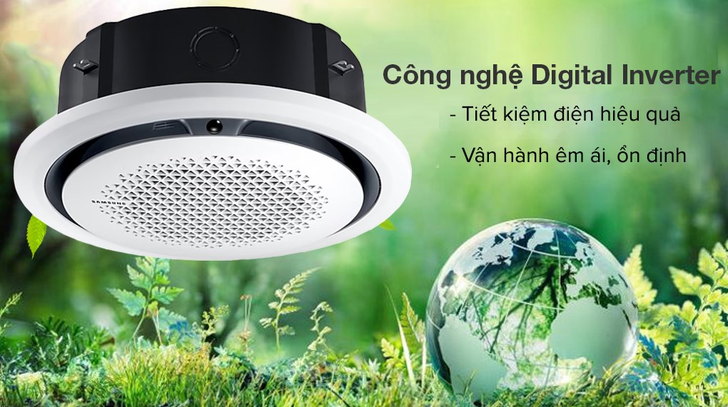 Máy lạnh âm trần Cassette 360 độ Samsung Inverter 4 HP AC120TN4PKC/EA 3 Pha có thiết kế tròn đều độc đáo góp phần nâng tầm không gian sống của bạn, làm lạnh hiệu quả với cơ chế thổi gió đa chiều 360 độ, công nghệ làm lạnh nhanh Fast Cooling.