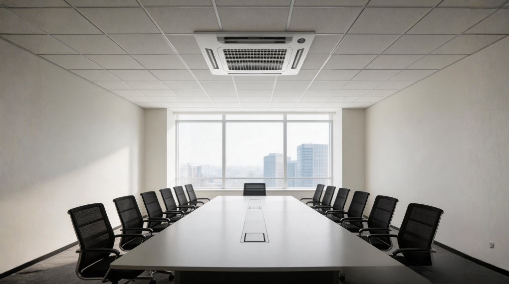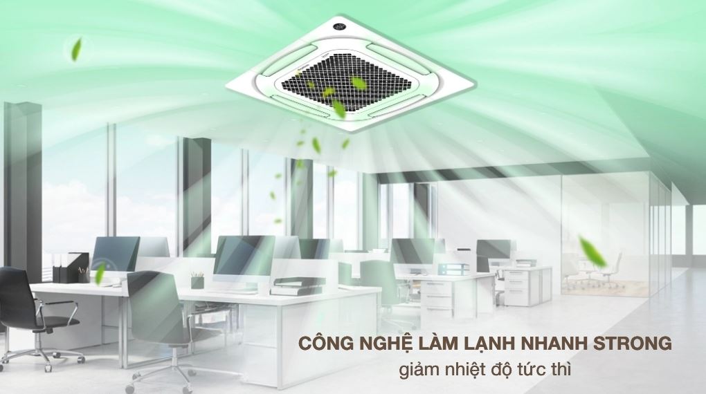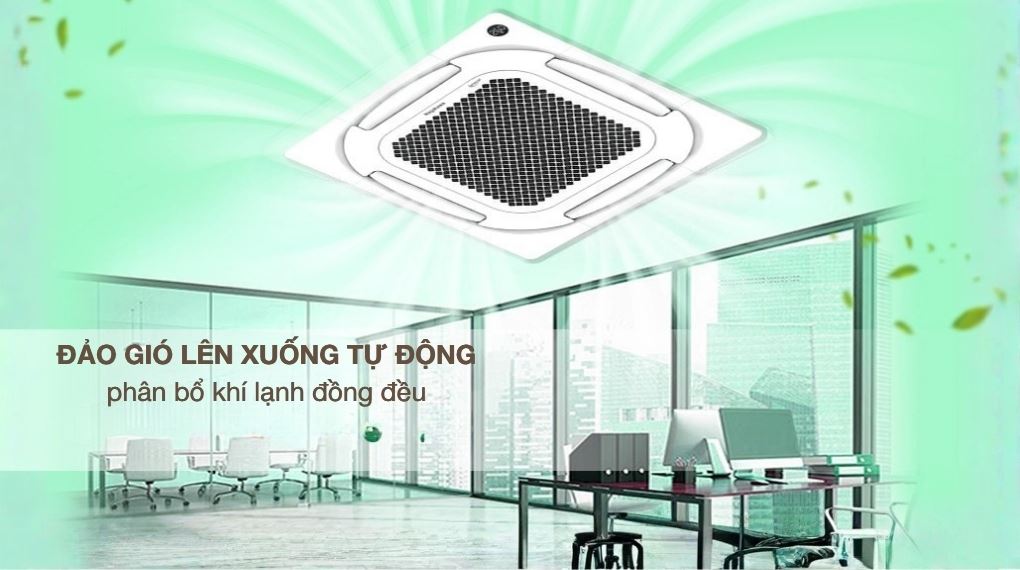 Sản phẩm được thiết kế theo kiểu âm trần cassette giấu toàn bộ phần thân máy phía trên trần, chỉ để lộ mặt nạ bên dưới, tạo nên không gian gọn gàng và chuyên nghiệp. Mặt nạ vuông hiện đại với các khe gió bố trí hợp lý, vừa đảm bảo thẩm mỹ vừa hỗ trợ phân bổ luồng khí hiệu quả.