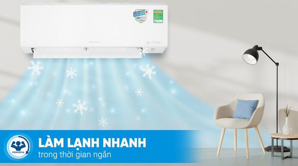 - Công nghệ làm lạnh nhanh Powerful mới: Sau khi kích hoạt chế độ Powerful, máy nén và quạt dàn lạnh sẽ hoạt động với tốc độ cao, giúp lưu lượng gió đạt cực đại. Nhờ đó, máy lạnh Daikin 2.5 HP này nhanh chóng hạ nhiệt độ trong căn phòng, mang lại hiệu quả làm lạnh nhanh, giúp bạn sảng khoái ngay tức thì.