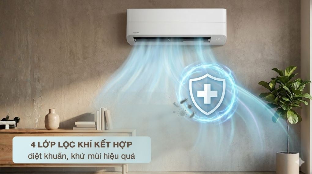 Máy lạnh Toshiba được trang bị hệ thống lọc không khí 4 lớp hoạt động theo cơ chế bổ trợ lẫn nhau, giúp làm sạch không khí một cách toàn diện từ bên trong dàn lạnh đến luồng khí thổi ra.