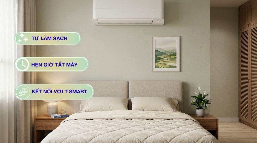 - Hệ thống lọc Toshiba IAQ kết hợp khả năng kháng khuẩn và khử mùi mạnh mẽ, giúp duy trì bầu không khí trong lành, mang lại cảm giác dễ chịu và sự an tâm khi sử dụng.