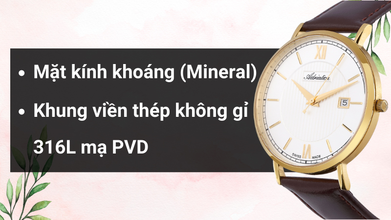 - Khung viền bằng thép không gỉ 316L mạ PVD bền đẹp, sáng bóng, không ngại điều kiện môi trường khắc nghiệt, dây da bò chất lượng, êm nhẹ và thoải mái